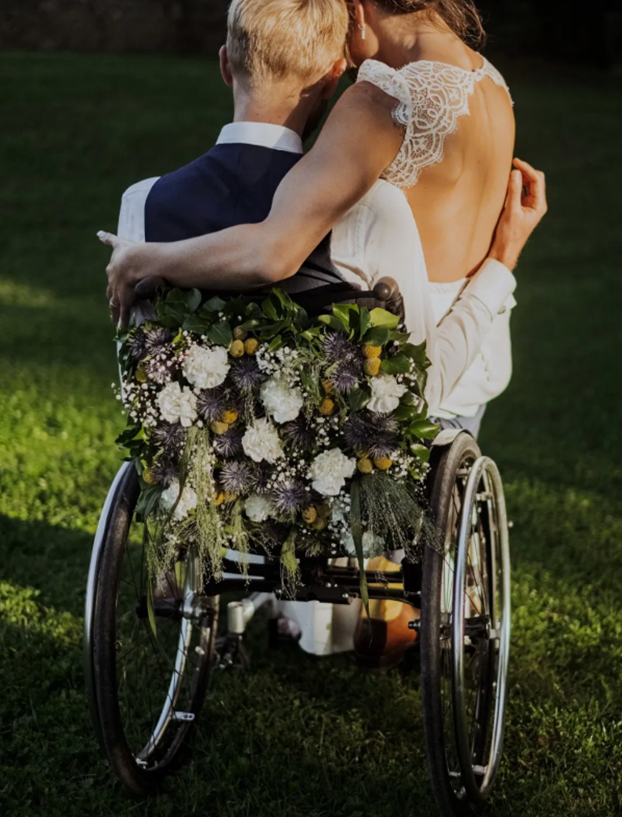 ID: A photo of a newlywed couple. The bride sits in the arms of a groom in a wheelchair, which has a big bouquet of flowers on the back.