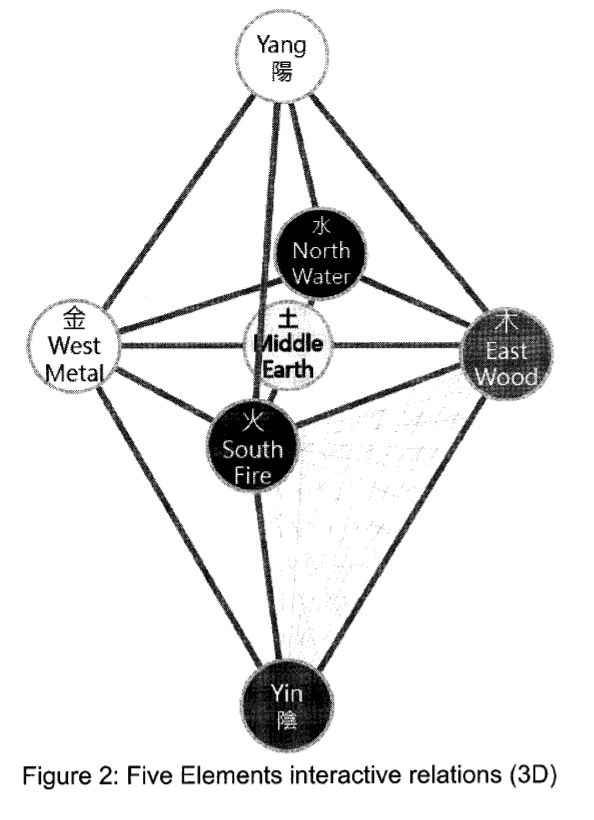 In order of positive influence, they include Red Fire, Yellow Earth, White Metal, Black Water, Cyan Wood and, in order of negative influence: Red Fire, White Metal, Cyan Wood, Yellow Earth, and Black Water. While this system can be drawn one-dimensionally, a third dimension must be utilized when including Yin and Yang, adding gendered connotations (Lee, 197).