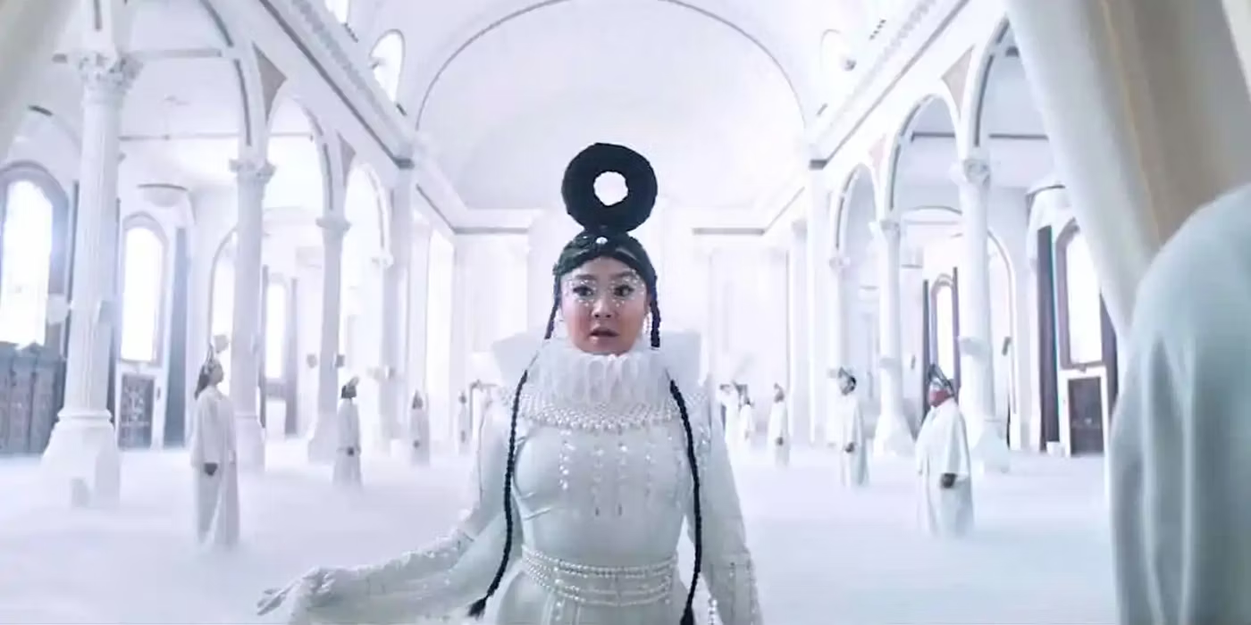 Diving into the movie, the color white, 白, conveys “complex humanistic emotions” for Jobu Tupaki (Chen 1365). According to Chinese color theory, white “is a basic color taboo,” designated the color of death, mourning, and funerals (He, 161). In the Everything Bagel dimension, everything but the Bagel is white, giving a sense of dread and all-encompassing inevitability. On the other hand, there are some commendable perceptions of white too. It may be considered the color of innocence, purity, and safety. Chen posits how the use of this dichotomous color in Chinese cinema gives complicated emotions to characters, which is befitting for Jobu Tupaki, being both villain and victim. In the Five-Elements-Theory, white is destructively impacted by red, evident by how Joy/Jobu is antagonized by Evelyn. Then, white is positively impacted by yellow, represented in the character Deirdre. When Deirdre is redeemed and given her character arc, it causes a domino effect, ending in the redemption of Jobu herself.