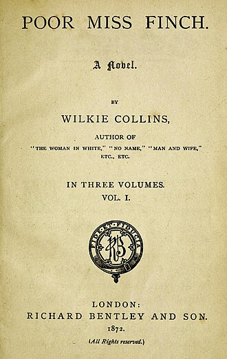 ID: A contemporary cover for Poor Miss Finch. It reads: Poor Miss Finch. A Novel. By Wilkie Collins, author of "The Woman In White," "No Name," "Man And Wife," etc., etc. In Three Volumes. Vol 1. London: Richard Bentley and Son. 1872. (All Rights Reserved.)