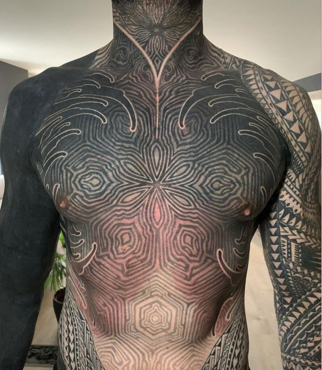 ID: A bovine lad in the forest with horns curved inward; a light brown, hairy body; a wreath of orange flowers around his shoulders; a tattoo on his right shoulder; a wide smile.