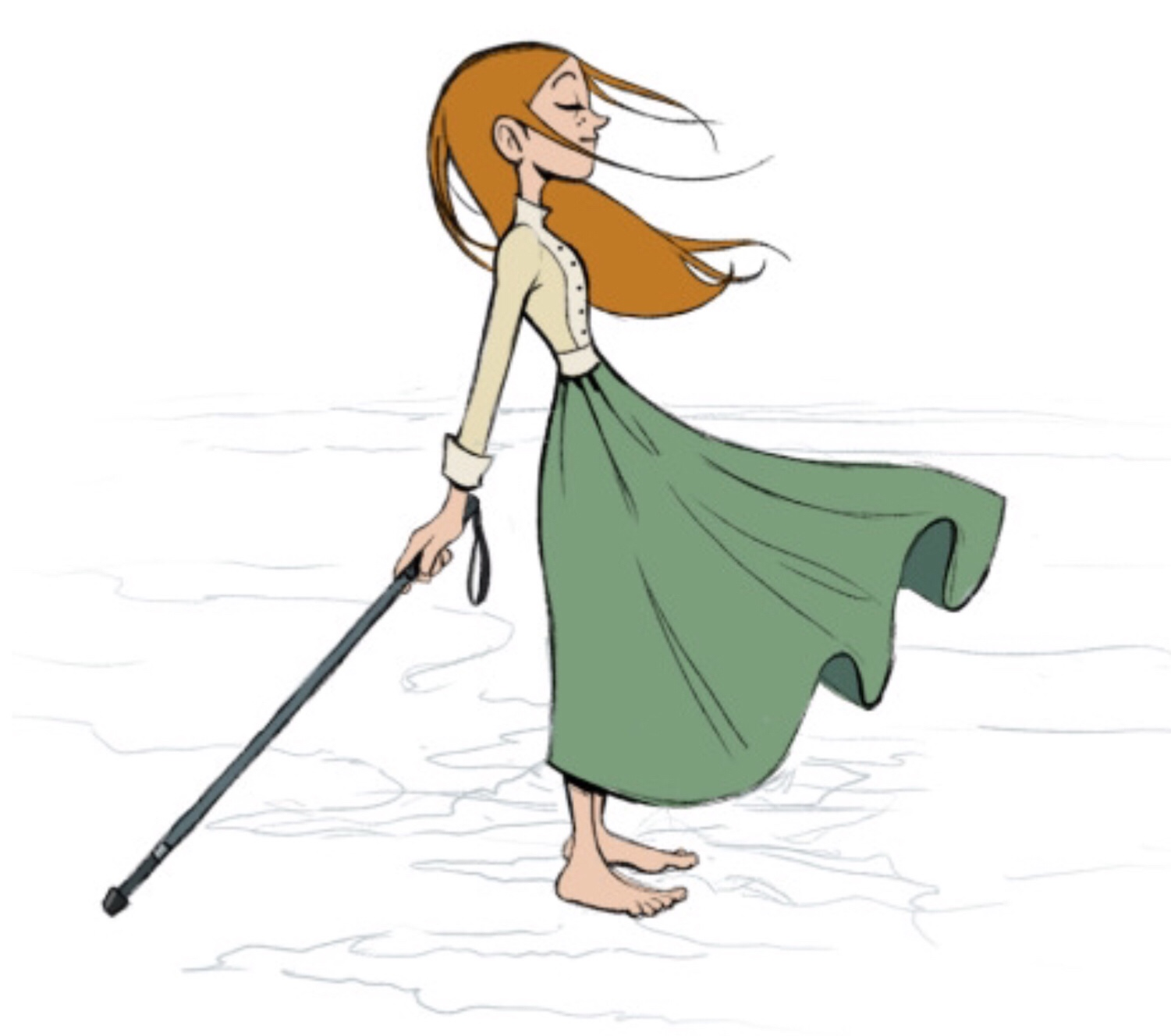 Image Descriptions: On the left, Cover design for All The Light We Cannot See. A picture of Saint-Malo in a blue filter. On the left, fan art of Marie-Laure, a girl with light brown hair, a cane, a cream sweater, and a green skirt. She stands barefoot in the wind.
