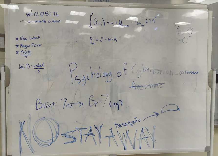 Image: A white board bearing all sorts of random things. "NO STAY AWAY" is scrawled at the bottom. "Psychology of Cybertronian Girlbosses" is in the middle. Prostitutes is marked through under that. An arrow connects the word Bananpeño to a a drawing of what supposedly it depicts.
