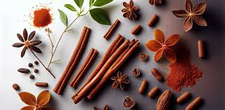 ID: An aesthetically pleasing picture of cinnamon sticks surrounded by cinnamon pods, flowers, and grounds.