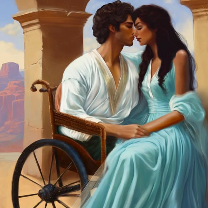 IDs: On the left, the cover art of the first book, Queen of Shifting Sands. Lystra looks over a desert, holding a dagger. In the middle, Lystra and Elerek lean in for a kiss. Lystra wears a seafoam gown and Elerek wears a loose white shirt in an old-fashioned wheelchair. On the right, the cover art for the second book, King of Star-cast Skies. Elerek looks over splashing ocean.