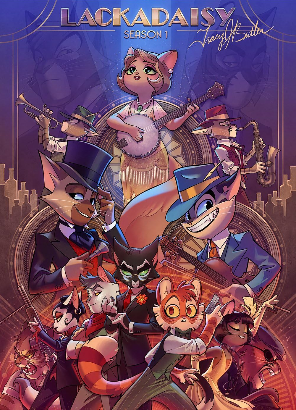ID: Poster for Lackadaisy, Season 1. Fourteen anthropomorphized cat characters pose.