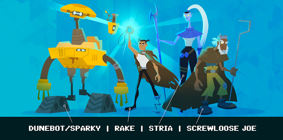 IDs: Top: Character lineup for the good guys: Dundebot and Sparky, a duo of yellow robots, one big with treads for feet and one small and flying; Rake, a young human with buzzed hair pulled back, a mechanical left foot, holding a glowing blue amulet; Stria, a tall blue alien with a white ponytail, yellow eyes, and a spear; Screwloose Joe, an old human man with a white beard, milky eye, tattered cloak, and metal shepherds crook. Bottom: Concept art of Rake standing on a desert planet, surrounded by ruins, gazing at a sunset with two suns, a glowing blue shard floating beside him.